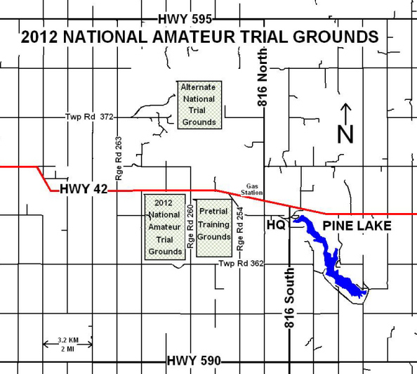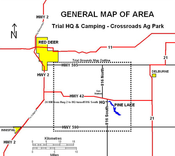 The Trial Headquarters are located approximately 35 km south east of Red Deer near Pine Lake, (see map)