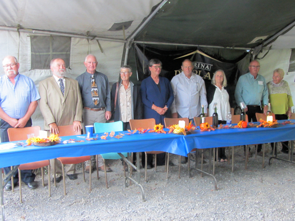 Left to right; Chief Marshal Dennis Harwood, Eastern Zone Judges Gerry Burmaster, Dave Wardle and wife Donna, Western Zone Judge Medie Robinson, National Retriever Club President Jim Andrew and wife Shiela, Field Trial Chair Dave Thompson and partner in everything retriever wife Jane.