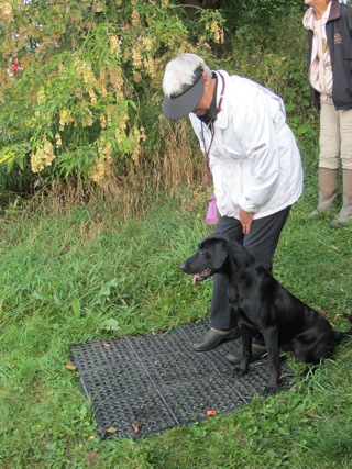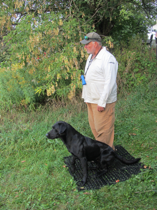 First up was Female Test Dog. For the go bird, Putzi went under the arc, up onto the dike and then back down into the water for her bird. On her way to the go bird Putzi stumbled in some high weeds along the road, so for safety reasons, the weeds were cut after the test dogs ran. She stepped on the left retired and had an excellent long centre retired. Male Test Dog was up next. Brady went to the gunners on the go bird and hunted the dike before coming down into the water to pick up the bird. He decided the fastest way back was on land. For the left retired, Brady went wide right and had a bit of a hunt in the area. His centre retired was very good as well. After the test dogs ran, the go bird was thrown along the dike on land and the long centre throw was changed from landing out in the field to landing in cover along the treeline.