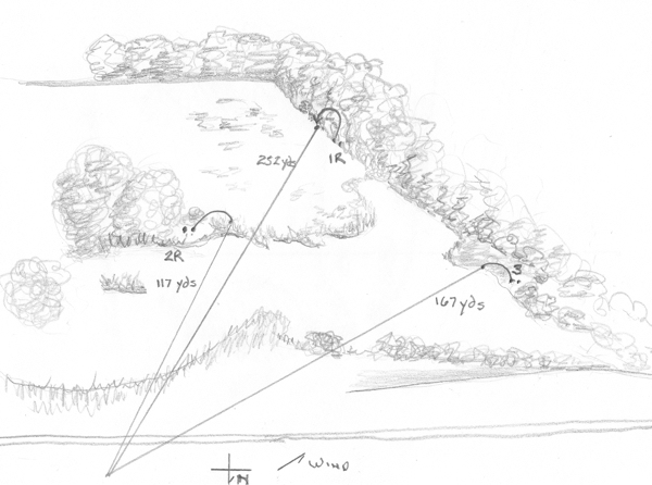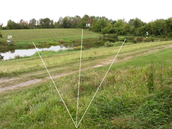 For Test 4 we are back in the same pond as the water blind. In fact the line taken to the left mark is over the point from the water blind. The test is being run from the opposite end of the pond. To start the day, the skies are overcast with the threat of rain. Temperature is 13C with the wind 11 km NE.Ducks are thrown for all the marks. The order of the guns is, centre, left, right. Both the centre and left guns retire and only the go bird gunners remain visible. All birds are thrown into the test. The long retired centre bird is thrown uphill into cover along the treeline. The left retired is thrown on land along the shoreline into cover, and the last right hand go bird is thrown along the shore but landing in water. Distances to the birds are; left 117 yards, right 167 yards and long centre bird is 252 yards.